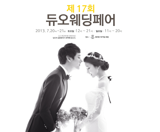 제 17회 듀오웨딩페어는 고객들의 쾌적한 관람을 위해 100% 사전예약을 통해 예약번호를 부여 받은 4,000쌍의 커플만 참석 가능하다. 무료참가신청 및 자세한 문의는 듀오웨드 홈페이지(www.duowed.com)나 전화 1577-2229로 하면 된다.