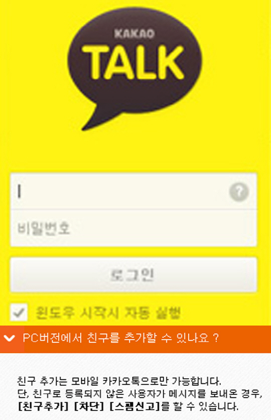 공지에 따르면 "PC버전에서 친구를 추가할 수 있나요?"라는 질문에 "친구 추가는 모바일 카카오톡으로만 가능하다"며 "단, 친구로 등록되지 않은 사용자가 메시지를 보내온 경우, '친구추가', '차단', '스팸신고'를 선택할 수 있다"고 설명했다.