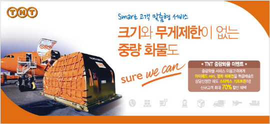 글로벌 특송 전문기업 TNT코리아(www.tnt.com/kr, 한국 대표이사 김종철)는 24일부터 8월 16일까지 30KG 이상의 중량화물 특송 서비스를 이용하는 고객을 대상으로 특별할인 캠페인을 실시한다고 밝혔다.