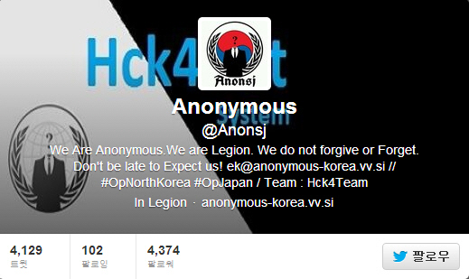 | 어나니머스 한국 공식 SNS로 여겨지는 트위터 '@Anonsj' |