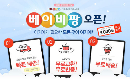 한편, 베이비팡은 오픈 기념 이벤트를 진행 중이다. 베이비팡 첫 구매가 '기저귀' 상품인 경우 3천원을 할인해 준다. 쿠팡 가입회원이라면 기존 쿠팡 ID로 바로 이용이 가능하다.