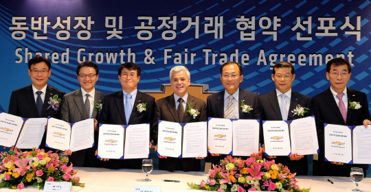 한국지엠주식회사(이하 한국지엠)이 27일 쉐보레 인천 부평중앙대리점에서 5개 딜러 및 한국지엠 전국대리점연합회(이하 연합회) 등 판매부문 사업 파트너들과 공정거래 및 동반성장 협약을 맺고 국내 판매 증진을 위한 결의를 다졌다.