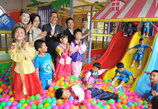 ◇아시아나항공 윤영두사장(뒷줄 가운데)이 26일 중국 하얼빈 우창시(五常市) 조선족 실험소학교와 아름다운 교실 자매결연식을 갖고, 채진원 주선양총영사관 부총영사(뒷줄 왼쪽에서 네번째), 장진화 우창시 부시장(뒷줄 왼쪽에서 두번째)과 함께 부속 유치원의 실내놀이터에서 기념촬영을 하고 있다.