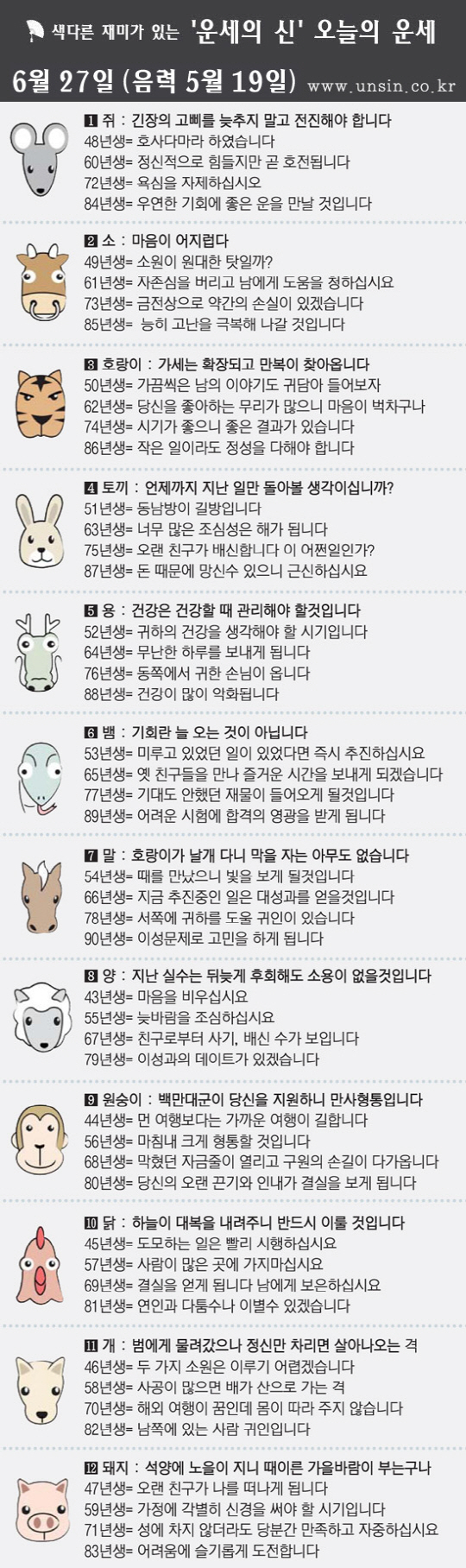 [직장인을 위한 오늘의 운세] 2013년 6월 27일 목요일(음력 5월 19일)