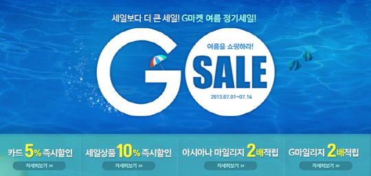 먼저 세일 기간 동안 'Daily G세일'을 통해 하루에 8개씩 특가 상품을 선보인다. 여름가전, 바캉스용품, 장마용품, 먹거리 등 여름 관련 상품을 대폭 할인한 가격으로 한정 판매한다. 상품은 매일 오전 10시마다 업데이트된다. 특가상품의 경우 신한, KB국민, 현대, 삼성, 롯데, NH농협 등 6개 신용카드로 결제하면 최대 1만원 한도에서 10% 즉시할인 혜택이 주어진다. 또 세일 품목 중 패션, 마트 등 일부 상품도 6개 카드를 이용하면 최대 3천원 한도에서 5% 즉시할인 혜택을 제공한다. 이외에도 여름의류를 9900원 균일가로 선보이는 기획전과 인기 캠핑/레저용품을 저렴하게 선보이는 할인전도 진행된다.