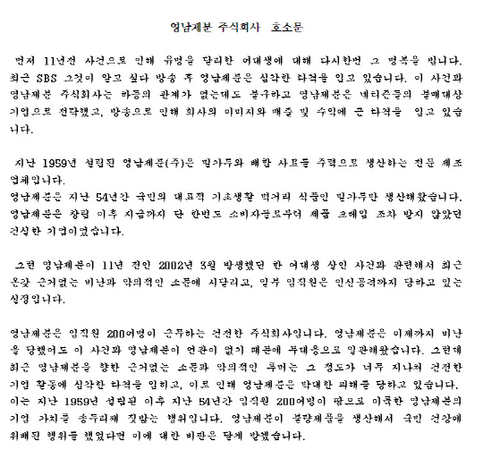 영남제분은 임직원 200여명이 근무하는 건전한 주식회사입니다. 영남제분은 이제까지 비난을 당했어도 이 사건과 영남제분이 연관이 없기 때문에 무대응으로 일관해왔습니다. 그런데 최근 영남제분을 향한 근거 없는 소문과 악의적인 루머는 그 정도가 너무 지나쳐 건전한 기업 활동에 심각한 타격을 입히고, 이로 인해 영남제분은 200여명이 땀으로 이룩한 영남제분의 기업 가치를 송두리째 짓밟는 행위입니다. 영남제분이 불량제품을 생산해서 국민 건강에 위배된 행위를 했었다면 이에 대한 비판은 달게 받겠습니다.