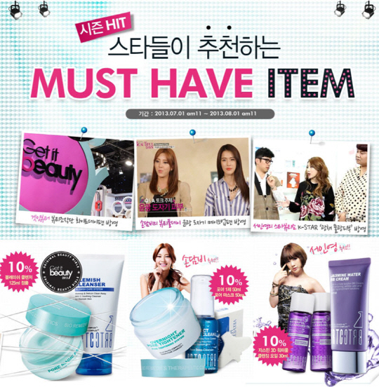 또한 손담비의 뷰티풀데이즈에 소개된 오버나이트 포어 타이트너(60ml_43,000원)는 잠든 사이 모공을 꽉 조여주는 데일리 수면팩으로 10%할인과 함께 블랙헤드를 말끔하게 제거해 주는 BRTC 포어 딥 클렌저(50ml_12,500원) 정품을 추가 증정하며, 서인영의 스타뷰티쇼에 소개 된 쟈스민 워터 비비크림(35ml_32,000원) 또한 10% 할인과 함께 쟈스민 3D 워터풀 클렌징 오일 30ml*2개를 추가 증정하는 혜택을 드리고 있다.