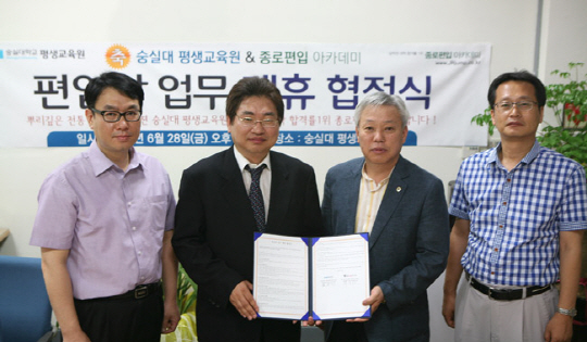 조춘구 숭실대 평생교육원 원장(가운데, 우)이 편입학 업무 제휴를 체결한 후 기념 촬영을 하고 있다.