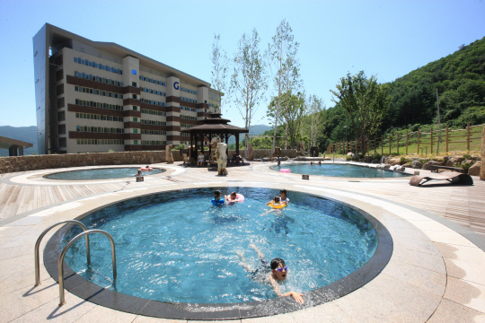 특히 유럽의 마을에 와 있는 듯 한 느낌을 주는 마운틴콘도는 내방객 사이 인기다. 마운틴콘도 정원에는 멋진 야외 풀이 펼쳐져 있다. '하늘샘', '바다샘'이라는 이름의 야외 풀은 사철 적당한 수온을 유지하고 있어서 자연의 풍치속에 노천탕의 묘미를 즐길 수 있다. 주말(금~일) 수영복을 갖춘 경우라면 무료 이용이 가능하다. 드넓게 펼쳐진 잔디밭도 가족들에게는 멋진 놀이공간이다. 공하나만 준비해 온다면 아이들과 시간가는 줄 모르고 즐거운 시간을 보낼 수가 있다.