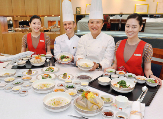 또 열두 초계탕은 여름철 대표 궁중 보양식으로 시원한 닭 육수에 호박씨, 해바라기씨 등의 견과류와 자체 개발한 삼색 포두부 국수 등 12가지 재료를 넣어 일등석 유럽 노선에 서비스 된다.