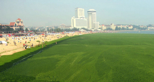 중국의 휴양지 해변이 푸른 바다가 아닌 녹색 바다로 변했다.