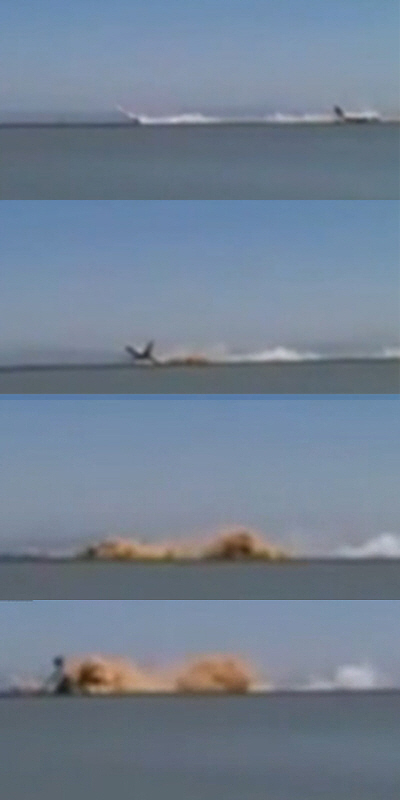 비행기를 뒤따라 흰 연기가 피어오르기 시작하고, 이후 비행기 기수가 크게 튀어 오르면서 큰 불길에 휩싸인다. 영상을 자세히 보면 착륙하기 직전 비행기는 위로 향하려는 듯 기수를 들지만 곧바로 가라앉았다.