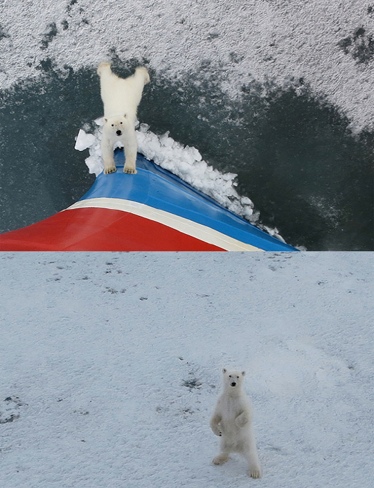 한 선원이 촬영한 것으로 알려진 이 사진에는 어린 북극곰이 애처로운 눈빛으로 마치 '우리집에서 나가달라'고 애원하듯 앞발로 배를 막아선 모습이 담겨있다.