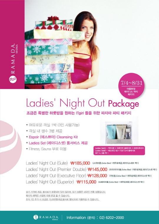 Ladies Night Out 패키지는 타입 별 객실 1박에 현대 여성들의 라이프 스타일을 고려하여, Espoir (에스쁘아) 3-Step Cleansing 키트 제품이 증정되며 모든 패키지에 Fitness, Sauna 무료 이용으로 피로를 풀 수 있는 혜택이 주어진다.