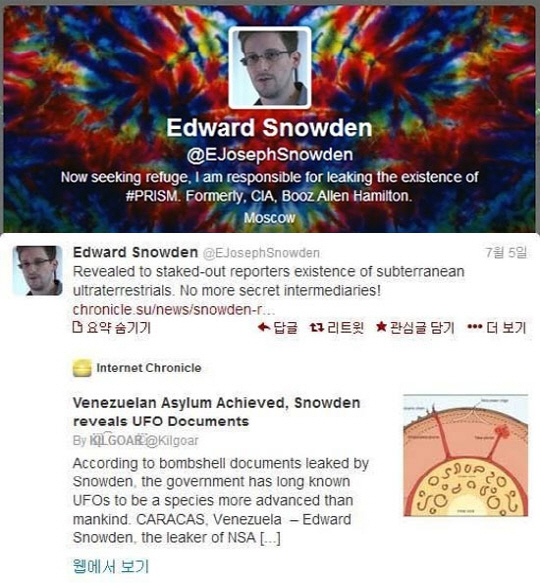스노든은 5일 자신의 트위터를 통해 "정부는 인류보다 아주 진보된 종족(UFO)을 인지한지 오래됐다(the government has long known UFOs to be a species more advanced than mankind)"며 폭로했다.