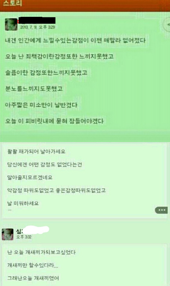 심군은 지난 9일 오후 3시 29분 자신의 카카오스토리에에 "내겐 인간에게 느낄 수 있는 감정이 이젠 메말라버렸다"며 "오늘 난 죄책감이란 감정 또한 느끼지 못했고, 슬픔이란 감정 또한 느끼지 못했고, 분노를 느끼지도 못했고, 아주 짧은 미소만이 날 반겼다. 오늘 피냄새에 묻혀 잠들어야겠다"고 적었다.