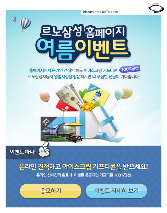 르노삼성 홈페이지 여름 이벤트를 통해 르노삼성자동차 홈페이지 내 온라인 상세견적 서비스를 이용한 후 이벤트에 응모하는 모든 고객에게 아이스크림 기프티콘을 증정한다. 무더위와 장마로 지점 방문이 어려운 여름철을 맞아 온라인 견적 서비스 이용 고객이 증가할 것으로 예상되어 '르노삼성 홈페이지 여름 이벤트'에 대한 호응도 높을 것으로 기대된다.