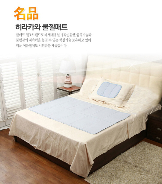 냉방병과 전기료 폭탄 걱정 없이 더위를 이기는 방법으로 찬 물 샤워와 쿨매트 이용을 생각할 수 있다. 무더위에서 편안한 수면으로 안내하는 히라카와쿨젤매트는 일반 침구에 비해 5% 이상 냉감을 잘 전달한다.