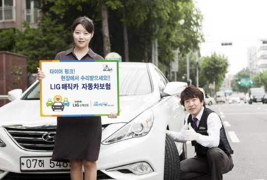 LIG손해보험(사장 김병헌)이 'LIG매직카자동차보험' 가입 고객의 편의와 만족을 높이기 위해 업계 최초로 타이어 펑크수리 서비스를 신설했다.