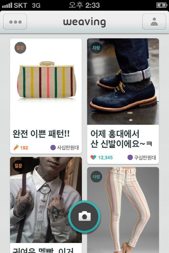 위빙(Weaving)은 기존에 공동구매나 할인 형식의 쇼핑 어플리케이션과는 다른 방식의 쇼핑 어플리케이션으로, 이용자의 구매결정에 확신을 더해주는 것이 가장 큰 특징. 사용자는 구매 여부에 대해 고민 중인 상품의 이미지와 간단한 코멘트를 '위빙(Weaving)'에 등록하면, 위빙 친구들은 해당 상품을 '질러', '말어' 기능으로 투표하고 코멘트를 달 수 있다. 또 질문자는 SNS 친구와 해당 아이템 전문가의 투표 및 코멘트를 통해 구매결정에 대한 확신을 얻을 수 있게 된다. 친구들이 올린 질문에 답변을 다는 것도 또 다른 재미요소 중의 하나다.