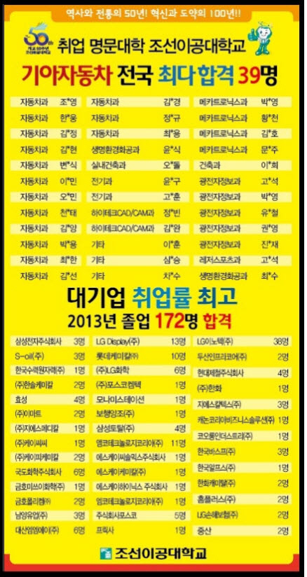 조선이공대학교(총장 김왕복)가 최근 진행된 2013년 기아자동차 신입사원 공개채용에서 39명의 합격자를 배출하며 취업 명문 대학교로서의 입지를 확고히 했다.