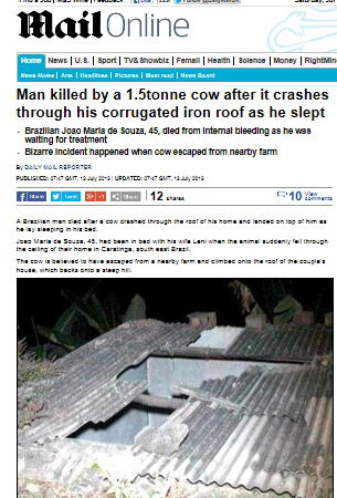 이 암소는 근처 농장에서 탈출한 후 집 지붕에 올라갔다가 떨어졌으며 남성이 거주하던 집은 산비탈 아래에 위치한 것으로 알려졌다.
