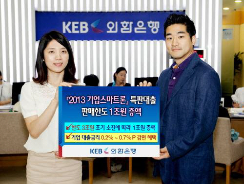 외환은행(은행장 윤용로/www.keb.co.kr)은 신규 기업고객 유치를 통한 기업고객 기반확대와 글로벌 경기 악화로 어려움을 겪고 있는 국내 기업을 지원하기 위하여 지난 1월부터 총 3조원의 한도로 시행 중인 '2013기업스마트론' 판매한도가 조기 소진됨에 따라 7월 15일부터 판매한도를 1조원 추가 증액하여 특별 판매한다고 밝혔다.