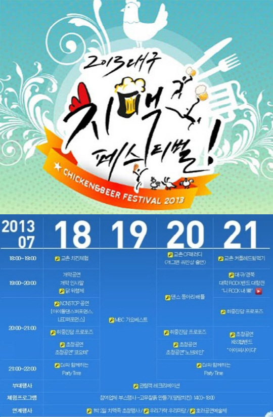 대구시와 (사)한국식품발전협회는 '치맥(치킨+맥주)' 문화를 소재로 교촌치킨을 비롯한 농림축산식품부, 식약처, 한국농수산식품유통공사, 중국 칭다오시 등의 후원을 받아 5일간 매일 오후 4시부터 밤 10시까지 치맥페스티벌이 열린다.