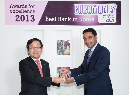 하나은행(은행장 김종준, www.hanabank.com)은 홍콩에서 개최된 유러머니(Euromoney)誌의 'Award for Excellence 2013' 시상식에서 국가별 최고상인 '대한민국 최우수 은행(Best Bank in Korea)'을 수상했다고 밝혔다.
