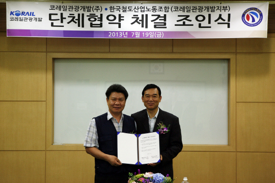 코레일관광개발(대표이사 이건태)은 지난 19일 본사 회의실에서 한국철도산업노동조합(위원장 김현중)과 단체협약을 체결했다.
