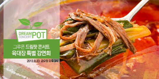 글로벌 No.1 소셜커머스 기업 그루폰(대표 김홍식, www.groupon.kr)은 '드림딜' 캠페인의 일환으로 옛날 전통 육개장 전문점 육대장(대표 최형욱, www.yukdaejang.co.kr)과 함께 성공한 사장님의 노하우를 성공할 사장님들에게 직접 전수하는 강연회 '드림팟 콘서트'를 실시, 31일까지 참가 신청을 받는다.