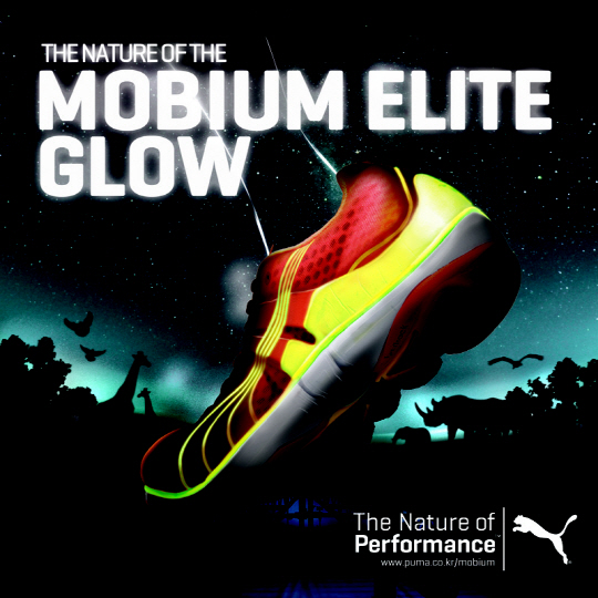 모비움 엘리트 글로우 러닝화는 어두운 환경에 적응하는 고양이 눈에서 아이디어를 얻어 밤에 러닝을 즐기는 나포츠족(나이트 스포츠)을 위해 빛을 반사하고 발광하는 야광 기능으로 안전하게 달릴 수 있다는 것이 푸마의 설명이다.