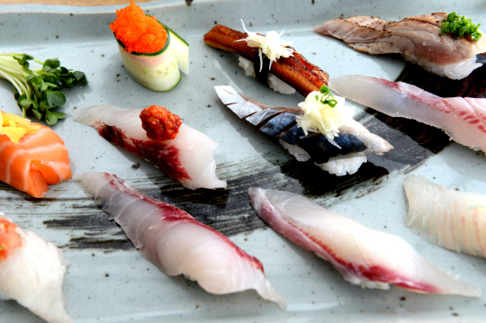요즘은 융복합이 대세다. 맛집에도 이 같은 컨셉을 반영한 곳이 있어 흥미롭다. 서울 강남구 역삼동 오렌지나인 빌딩 8층 스카이라운지에 자리한 스시전문점 '스시자리(ZARI)'가 바로 그곳이다. 오렌지나인 빌딩은 건물 3~7층이 실내스크린골프장으로 이른바 '펀포츠(fun+sports)'를 지향하는 복합문화체육공간이다. 신나는 스크린골프와 맛난 스시가 결합돼 편리와 재미를 함께 추구하고 있는 셈이다. 따라서 스시자리는 자연스럽게 골프장의 클럽하우스 역할을 하고 있다. 스크린골프에 앞서 일식으로 식사를 하거나, 또 라운드 이후엔 툭 트인 스카이라운지에서 시원한 맥주 한잔을 즐길 수 있어 인기다. 더 편리한 것은 스크린골프룸에서 주문을 하면 고급 스시를 배달해 준다는 점. 먹기에도 간편하고, 냄새걱정이 없어 라운딩 도중 출출함을 달래기론 최고다.