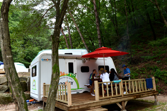 비용은 카라반 크기에 따라 10만(4인실)~25만 원(6인실) 선으로 성수기 펜션 등의 숙소와 별 차이가 없다. 인터넷(www.goodaypark.com)예약만 받고 있다. 경기도 포천시 영북면 산정리 272번지