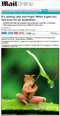 사진속 개구리는 마치 물 공포증이라도 있는 듯 비를 피하기 위해 무려 30분 동안이나 나뭇잎 줄기를 잡고 있었으며 비 오는 방향으로 나뭇잎의 각도를 조정하는 듯한 모습을 보이기도 했다고 사진작가는 전했다.