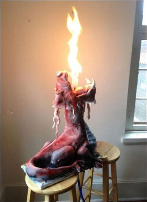 게재된 사진에는 붉은 빛깔의 용 모양 케이크가 두 개의 의자 위에 놓여 있는 모습이다. 이어 하늘을 향해 입을 크게 벌리고 있는 용이 커다란 불을 뿜고 있는 듯 묘사돼 있어 또 하나의 재미를 선사했다.