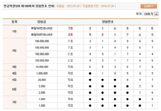 연금복권 108회차 1등 당첨번호가 발표됐다.