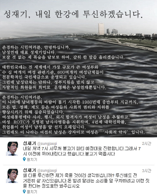 성재기 남성연대 대표가 한강 투신을 예고해 파문이 일고 있다.