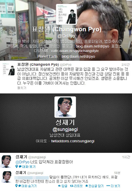 25일 표창원 전 교수는 자신의 트위터에 "남성연대 대표 자살 예고 관련 대책은 결코 입금 등 그 요구를 받아주는 것이 아닙니다"라며 "정신보건센터 등의 자살방지 정신과 긴급 상담 진료 등 응급 의료대책입니다"라는 글을 게재했다.
