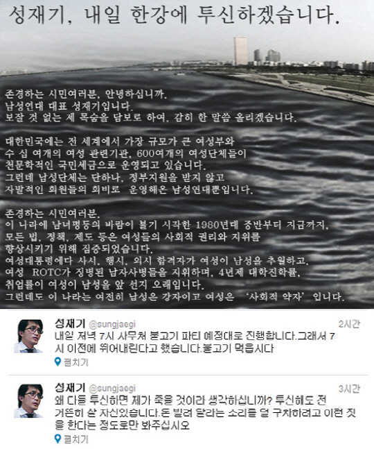 남성연대 성재기 대표가 26일 한강 투신을 예고한 가운데 그에게 네티즌들의 이목이 쏠리고 있다.