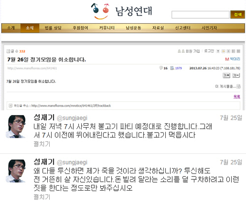 하지만 남성연대 홈페이지에는 오후 4시 43분경 '7월 26일 정기모임을 취소합니다'라는 글이 게재돼 예정된 '불고기 파티'가 취소됐음이 확인됐다.