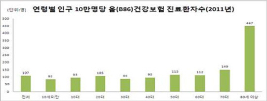 연령별로는 80세 이상이 인구 10만 명당 447명으로 가장 많았고, 70대가 149명, 50대가 115명으로 노년 환자의 비중이 컸다.