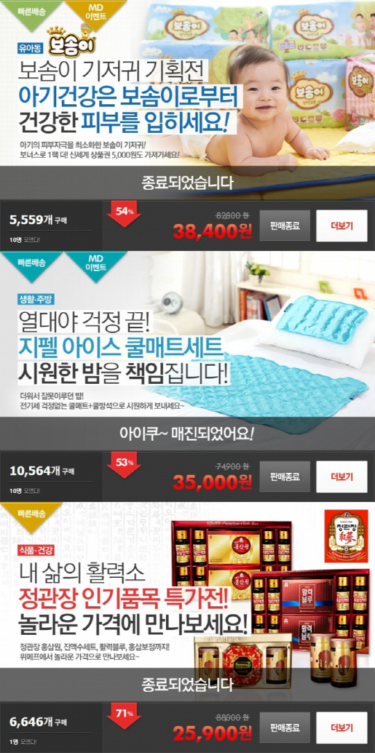소셜커머스 업계에서 확실한 선두를 차지하고 있는 위메프의 식품은 대기업 브랜드, 지역 특산물의 높은 순위가 눈에 띈다. 정관장 선물 세트, VIPS 세트, 홍천 한우 등이 소비자들의 많은 사랑을 받았다. 위메프 전체 카테고리 중 매출 1위를 차지할 정도로 폭발적인 성장세를 보이고 있는 식품은 신선식품의 경우 소셜커머스 업계에서 80% 이상의 점유율을 차지, 가격 및 품질 경쟁력에서 우위를 확보하고 있다.