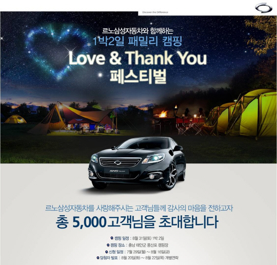 르노삼성자동차(대표이사 프랑수아 프로보)가 고객감동 마케팅의 일환으로 충남 태안 몽산포 해수욕장에서 르노삼성 차량을 보유한 고객 1000 가족을 초청, 1박 2일 동안 캠핑 행사인 'Love & Thank You(러브 앤 땡큐) 페스티벌'을 개최한다.