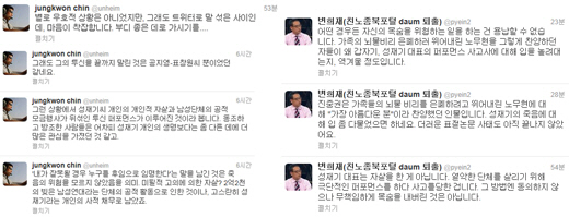 또 "그런 상황에서 성재기 씨 개인의 개인적 자살과 남성단체의 공적 모금행사가 뒤섞인 투신 퍼포먼스가 이루어진 것이라 봅니다. 동조하고 방조한 사람들은 어차피 성재기 개인의 생명보다는 좀 다른 데에 더 많은 관심을 가졌던 것 같고"라며 "그래도 그의 투신을 끝까지 말린 것은 공지영-표창원 씨 뿐이었던 같네요"라고 적었다.