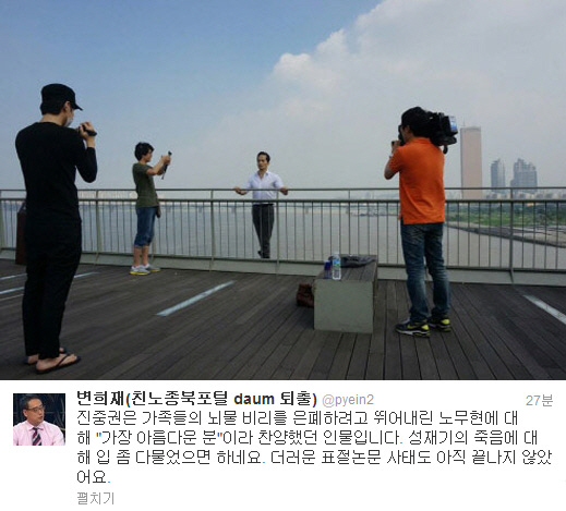 이어 "그런 상황에서 성재기씨 개인적 자살과 남성단체의 공적 모금행사가 뒤섞인 투신 퍼포먼스가 이루어진 것이라 본다"며 "동조하고 방조한 사람들은 어차피 성재기 개인의 생명보다는 좀 다른 데에 더 많은 관심을 가졌던 것 같고. 그래도 그의 투신을 끝까지 말린 것은 공지영-표창원씨 뿐이었던 것 같다"고 밝혔다.