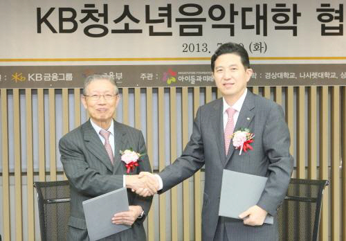 KB금융그룹(www.kbfg.com 회장 임영록) 은 30일 명동본점 7층 대회의실에서 KB금융그룹 임영록 회장, 아이들과미래 송자 이사장, 전국 5개 대학 산학협력단장 등이 참석한 가운데 'KB청소년 음악대학' 협약식을 실시했다.