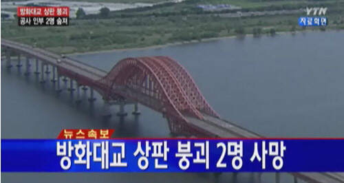 30일 오후 1시 8분께 서울 강서구 방화동 방화대교 남단 램프 공사현장에서 상판이 붕괴되면서 중장비가 넘어져 공사장 인부 3명이 깔린 사고가 발생했다.