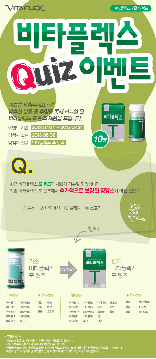 이 이벤트는 비타플렉스 홈페이지 ( www.vitaflex.co.kr ) 이벤트란에 접속, 기존 비타플렉스 포 틴즈에서 추가적으로 보강된 영양소가 아닌 것을 찾아 댓글로 응모하는 방식이다.