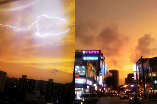 사진 속에는 온통 주황색으로 물든 하늘의 모습이 담겨 있다. 한 사진에는 선명한 주홍빛 하늘을 배경으로 번개 줄기가 포착돼 네티즌들의 시선을 사로잡았다.